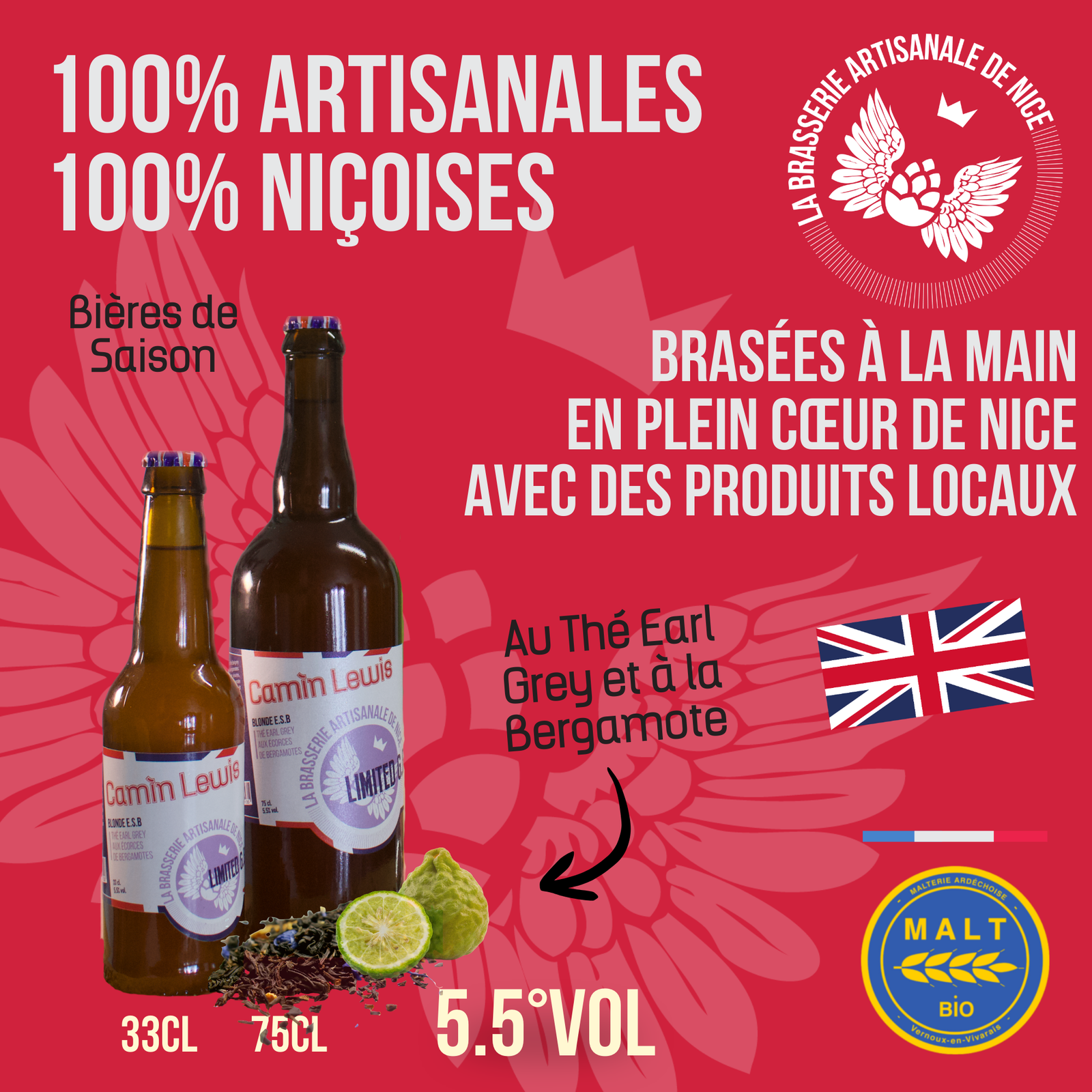 La plus anglaise de nos bières niçoises est un hommage au révérend Lewis Way. On lui doit, dit-on, notre célèbre promenade des Anglais. Camìn Lewis est une Extra Special Bitter infusée au thé Earl Grey assemblé maison (Thé Pettiagalla O.P. du Sri Lanka et bergamotes des collines niçoises).