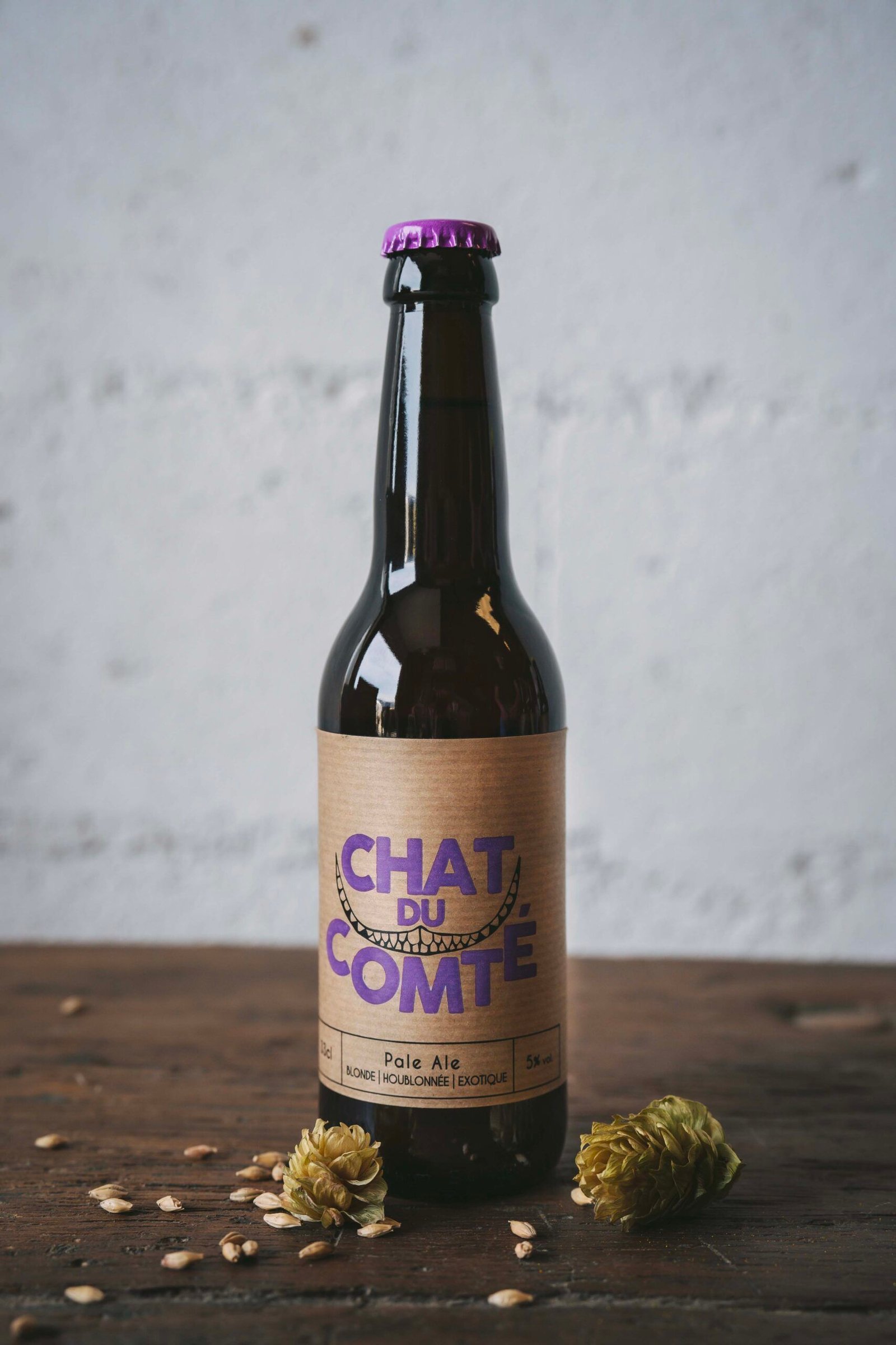 CHAT DU COMTÉ est une bière blonde à la robe dorée, généreusement houblonnée, qui offre de belles notes de fruits exotiques et une touche d’amertume parfaitement rafraichissante.