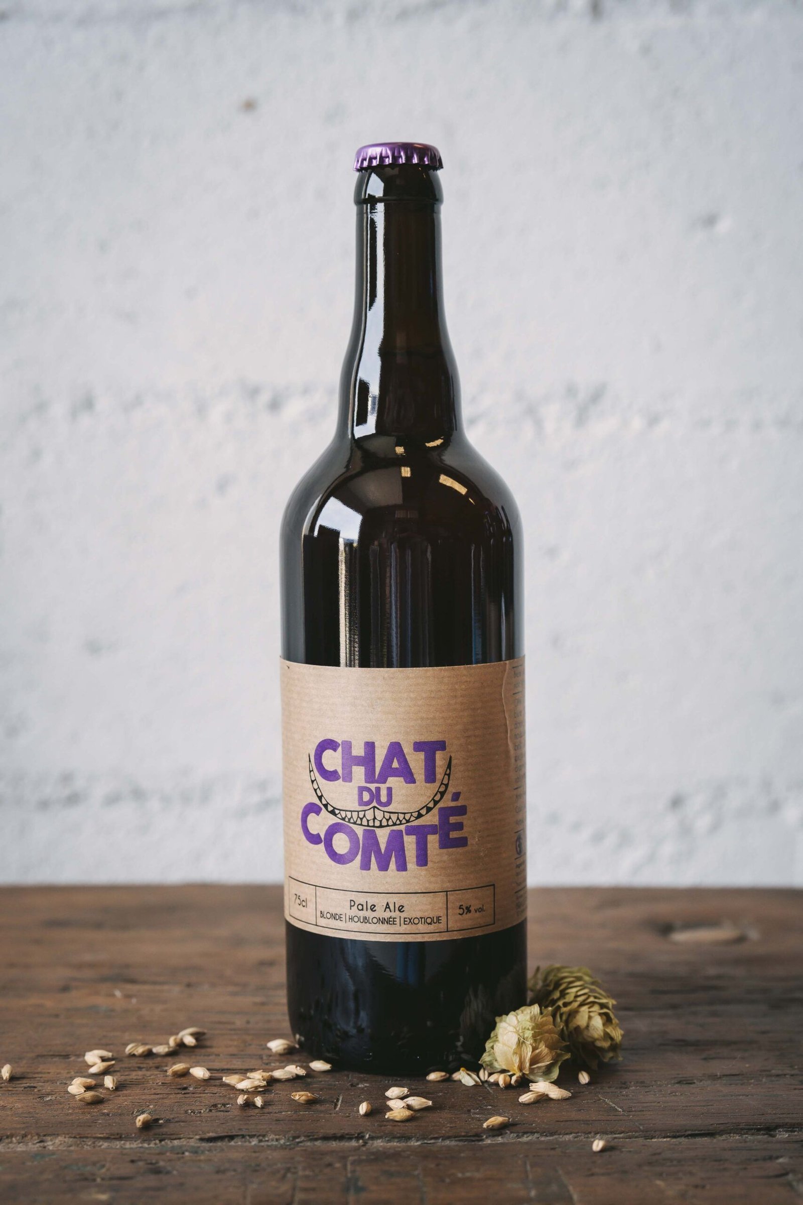 CHAT DU COMTÉ est une bière blonde à la robe dorée, généreusement houblonnée, qui offre de belles notes de fruits exotiques et une touche d’amertume parfaitement rafraichissante.
