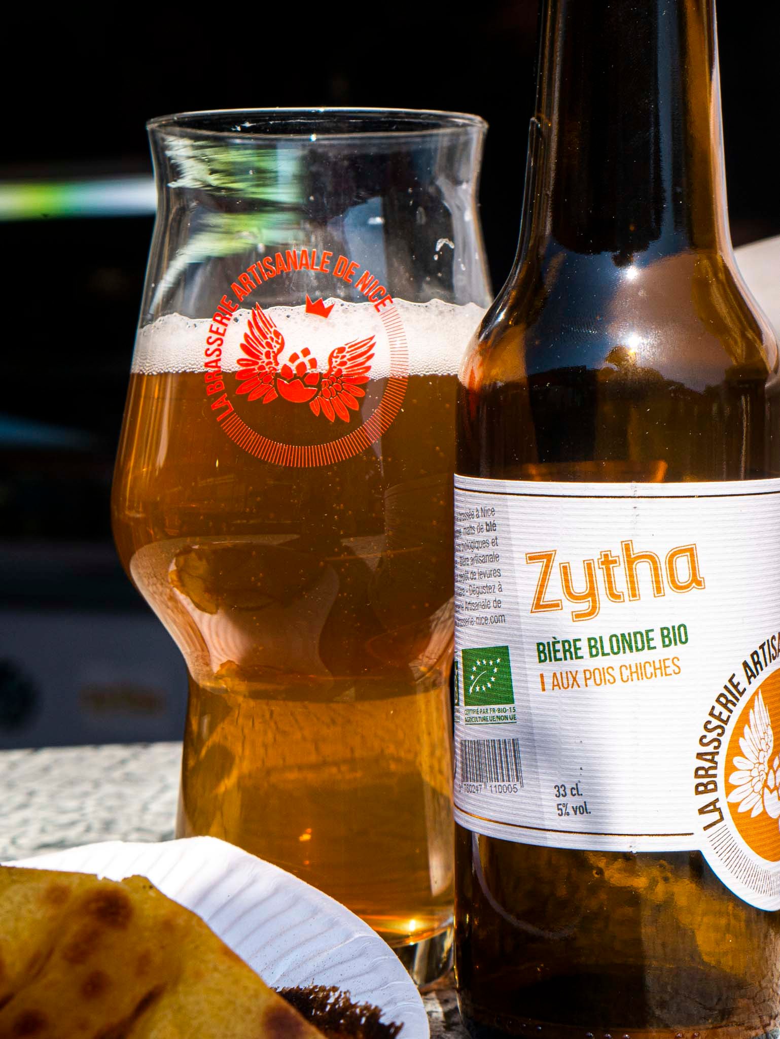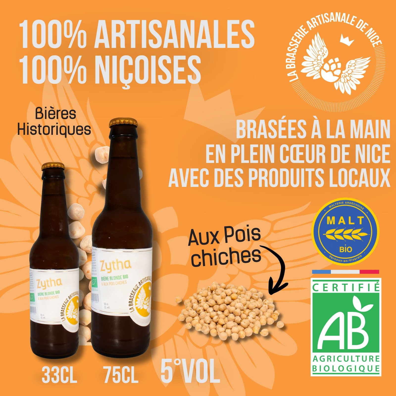 Signaler un abusZytha Notre bière blonde médaillée, l’incontournable ! Produit phare de la brasserie. Une bière qui rend hommage à la ville de Nice et à leurs fondateurs : son nom est inspiré de ce jus de céréales fermentées que préparaient les Grecs et les Egyptiens : Zythos. Comme un voyage méditerranéen, Zytha est une bière blonde aux pois chiches et aux graines de paradis. Fidèle à notre ancrage local, elle évoque la socca, ce plat emblématique du Vieux-Nice, mais aussi la cuisine orientale. Notes de dégustation de notre bière blonde Bière blonde jaune doré Mousse traditionnelle de bonne tenue, pétillante, fine et sans opulence. Nez expressif et équilibré, dominé par les épices méditerranéennes Fine amertume exhaussant les saveurs épicées : cardamome, cannelle, coriandre, girofle. Pois chiche présent en filigrane, procurant tenue et consistance Bière très équilibrée, grande buvabilité, matière bien intégrée soutenue par une grande fraîcheur À déguster à la « merenda », en apéritif ou en accompagnement de plats typiquement niçois et du bassin méditerranéen.
