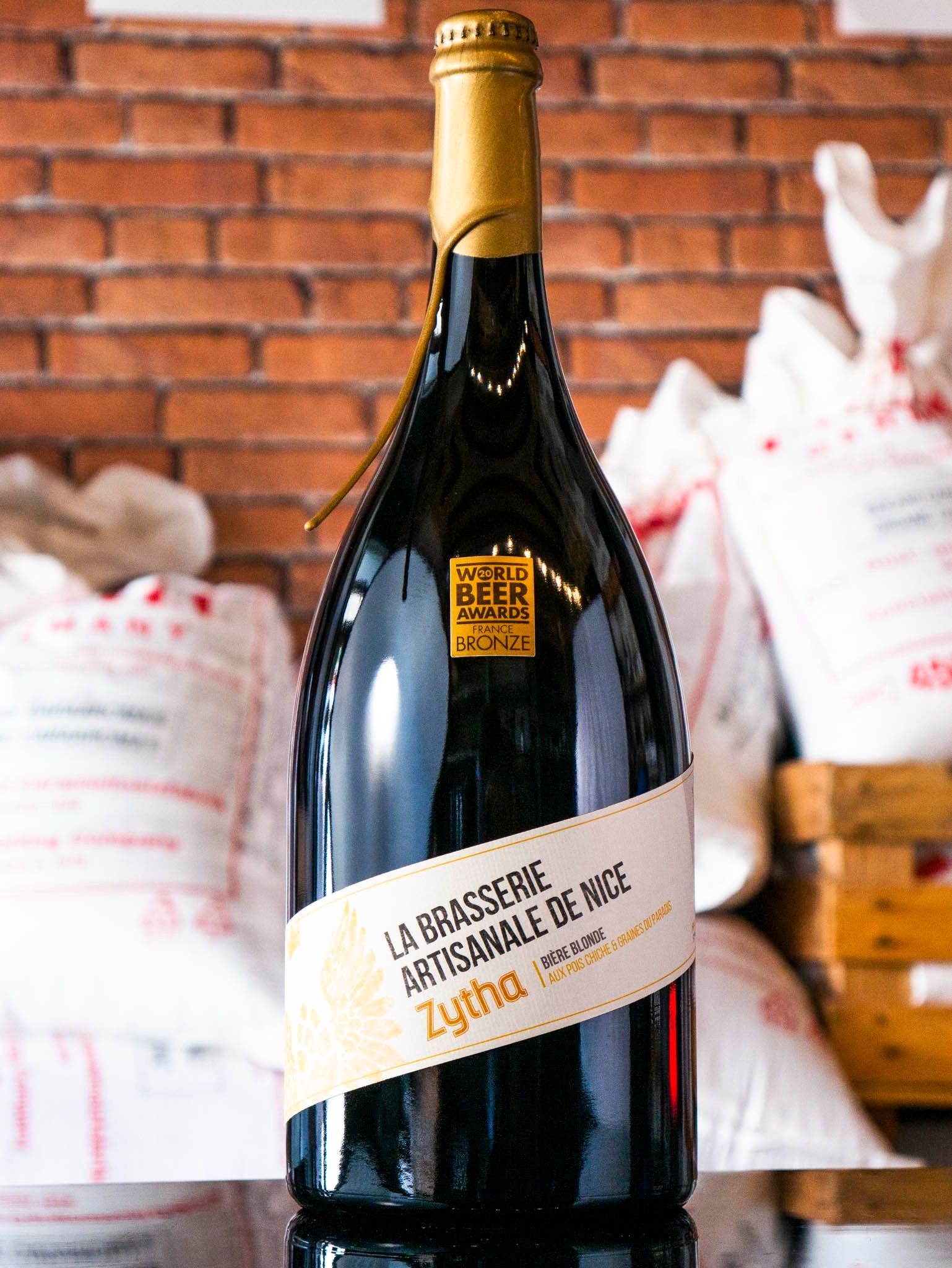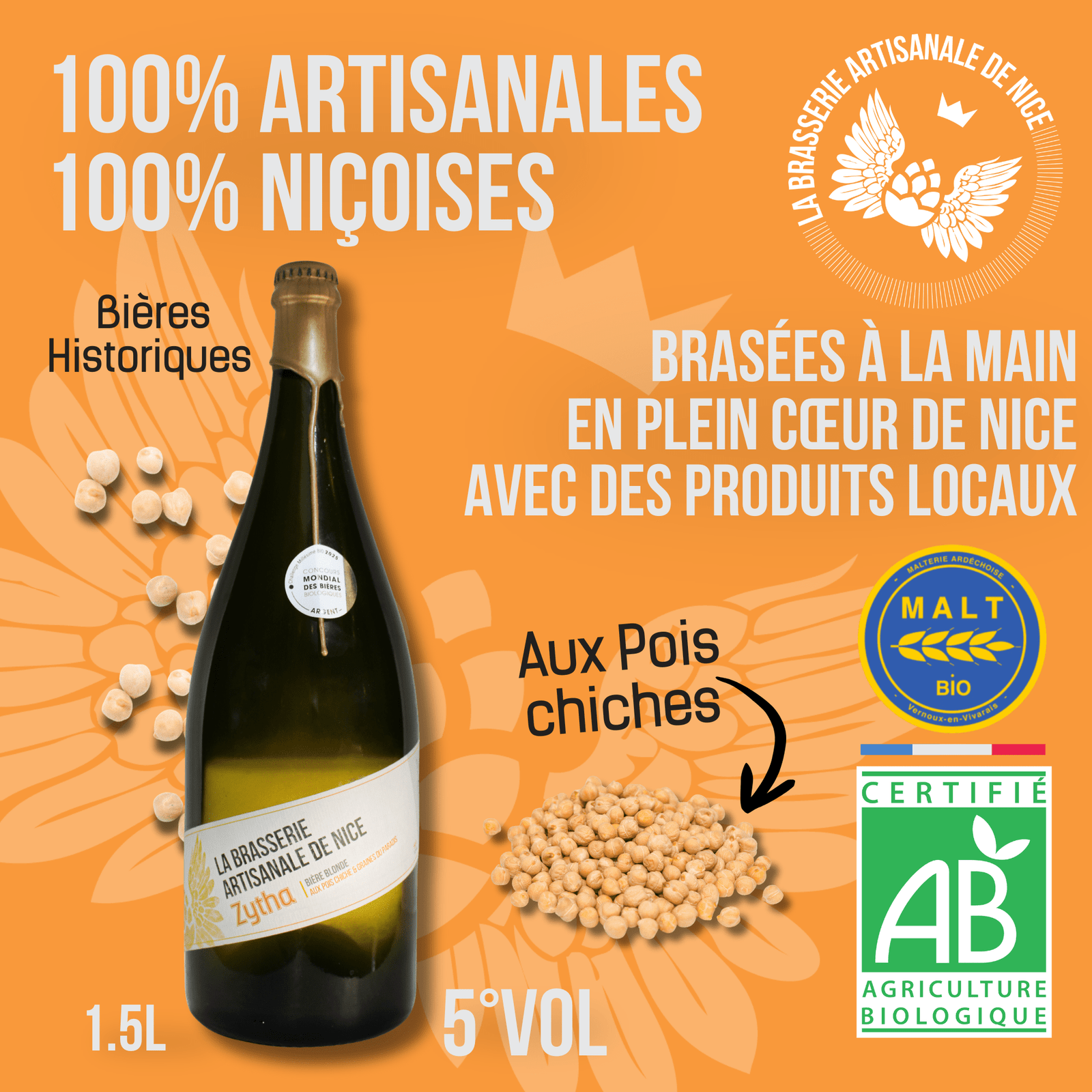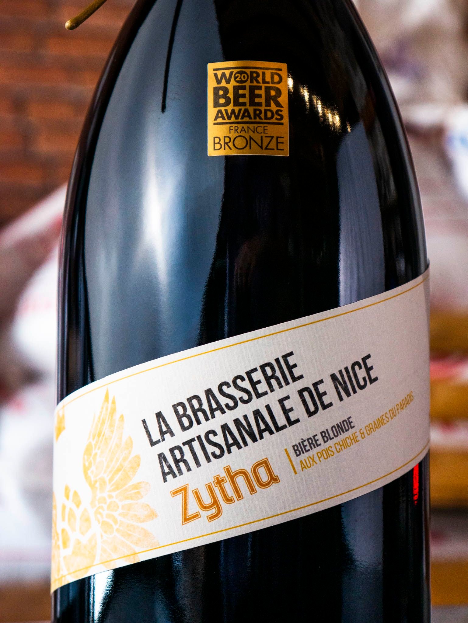 Zytha Notre bière blonde médaillée, l’incontournable ! Produit phare de la brasserie. Une bière qui rend hommage à la ville de Nice et à leurs fondateurs : son nom est inspiré de ce jus de céréales fermentées que préparaient les Grecs et les Egyptiens : Zythos. Comme un voyage méditerranéen, Zytha est une bière blonde aux pois chiches et aux graines de paradis. Fidèle à notre ancrage local, elle évoque la socca, ce plat emblématique du Vieux-Nice, mais aussi la cuisine orientale. Notes de dégustation de notre bière blonde Bière blonde jaune doré Mousse traditionnelle de bonne tenue, pétillante, fine et sans opulence. Nez expressif et équilibré, dominé par les épices méditerranéennes Fine amertume exhaussant les saveurs épicées : cardamome, cannelle, coriandre, girofle. Pois chiche présent en filigrane, procurant tenue et consistance Bière très équilibrée, grande buvabilité, matière bien intégrée soutenue par une grande fraîcheur À déguster à la « merenda », en apéritif ou en accompagnement de plats typiquement niçois et du bassin méditerranéen.